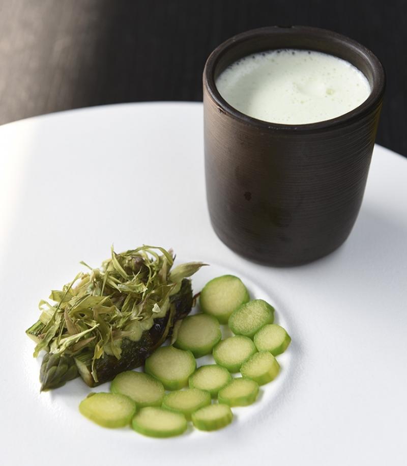 1 low temperature egg3 asparagus stalks (sliced lengthwise)