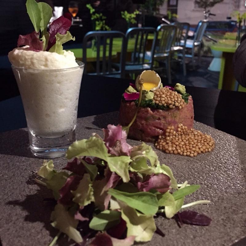 Chop the parsley and the ciboulette in little pieces. In a bowl , add the chopped parsley and ciboulette, the canola oil, the salt and the black pepper. Cut the chard in big pieces. In a pan, pour the chard, the milk and the milk cream. Let it reduce, in medium heat, until almost all the liquid dry. Then, pour the liquid in a blender and mix it well. Add the chilled butter and the salt. The puree will be very emulsified. Cook the mustard seed quickly in boiling water and then cool it in ice water. Put it aside. In a pan, add the vinegar, the salt and the sugar, and boil over medium heat. After boiled, add the mustard seed in it. Let it cool before using. On a cutting board, using a sharp knife, cut the anchovy, the capers and the filet mignon in little peaces. Pour it in a bowl and temper with the red onion, the olive oil, the English sauce, the Dijon mustard, the ketchup and the pepper. Mix it. Place the blend and then a thin layer of green parsley on an appropriate dish with the help of a ring.