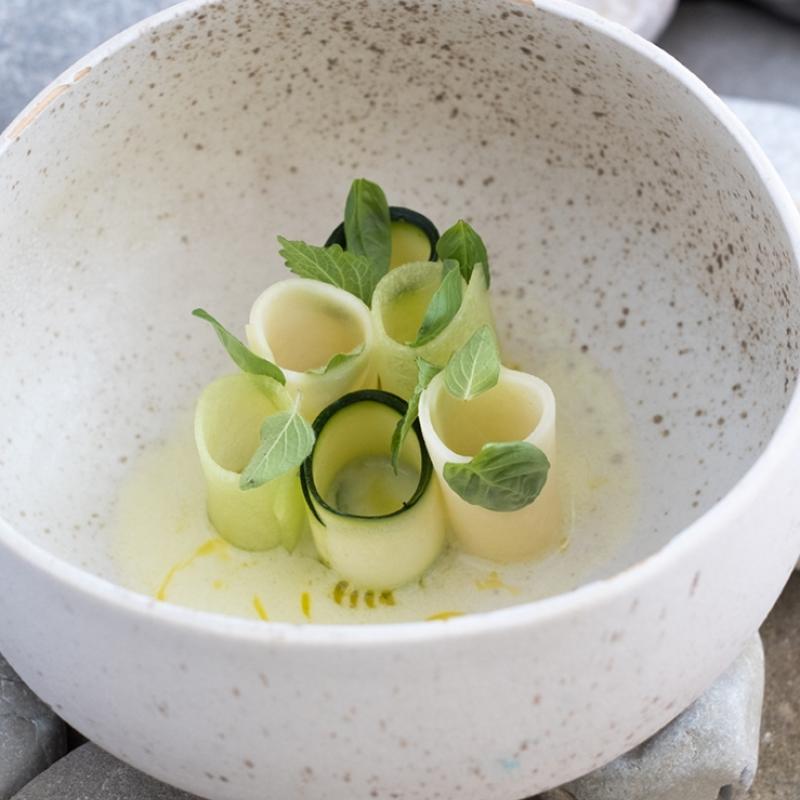 - Peel the cucumber and the melon, slice them finely and roll them like on the picture, all of them should have the same size.