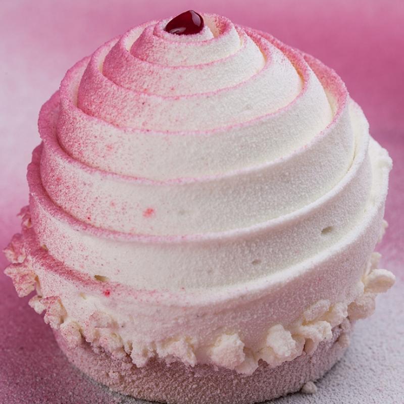 Fill in the meringue cups with blackcurrant/raspberry confit. Place them in the centre of the tartlets.