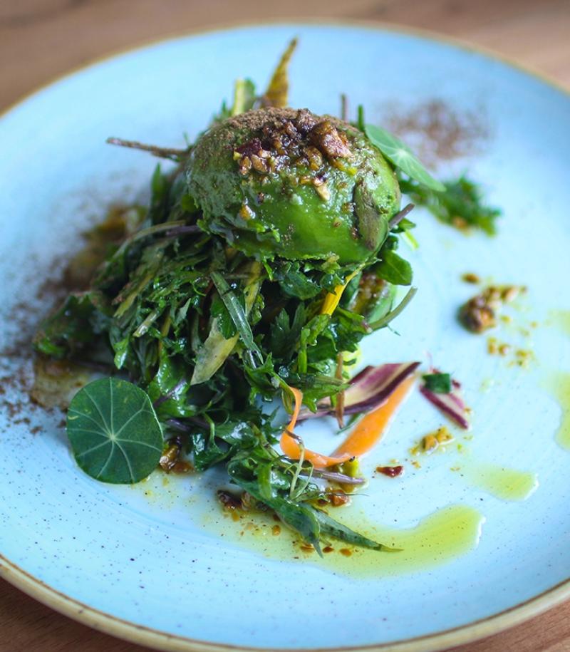 Spread a generous teaspoon of yuja sauce vertically on the bottom of a plate. Lay the roasted octopus chunks onto the sauce and fill the gaps alternating with the tuiles, apple slices and lamb’s lettuce leaves. Sprinkle over some bone marrow snow.