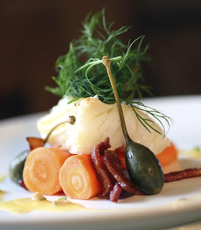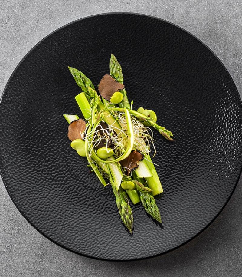 Place the octopus into a vacuum sealer bag suitable for sous vide cooking, pour in the kombu and soy soup, and carefully seal it. Cook the octopus for 2 hours and 10 minutes in a combi-steamer, using the steam function. Afterwards place the bag into ice water until it cools completely. Remove the octopus from the bag and cut it into small pieces, reserving some of the soup for the sauce.