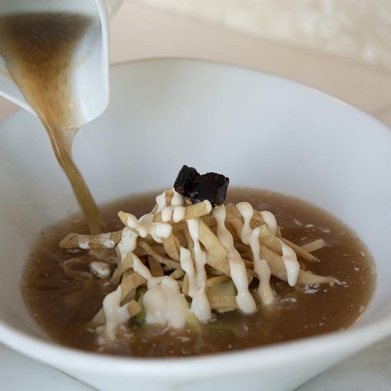 Divide the tortillas into 6 serving bowls, ladle the soup in them, and serve immediately, along with the garnishes.