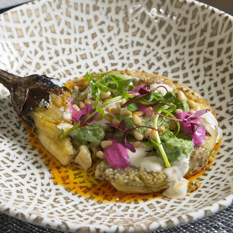 Open fired roasted eggplant in a Tahini sauce in a 3 color spectrum, and pine nuts and a smoked paprika oil