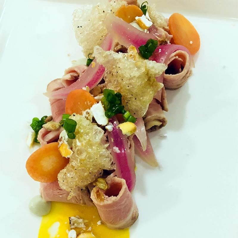 Place a tear-drop of carrot purée on the plate; on top, place the slices of rolled up cold cuts.