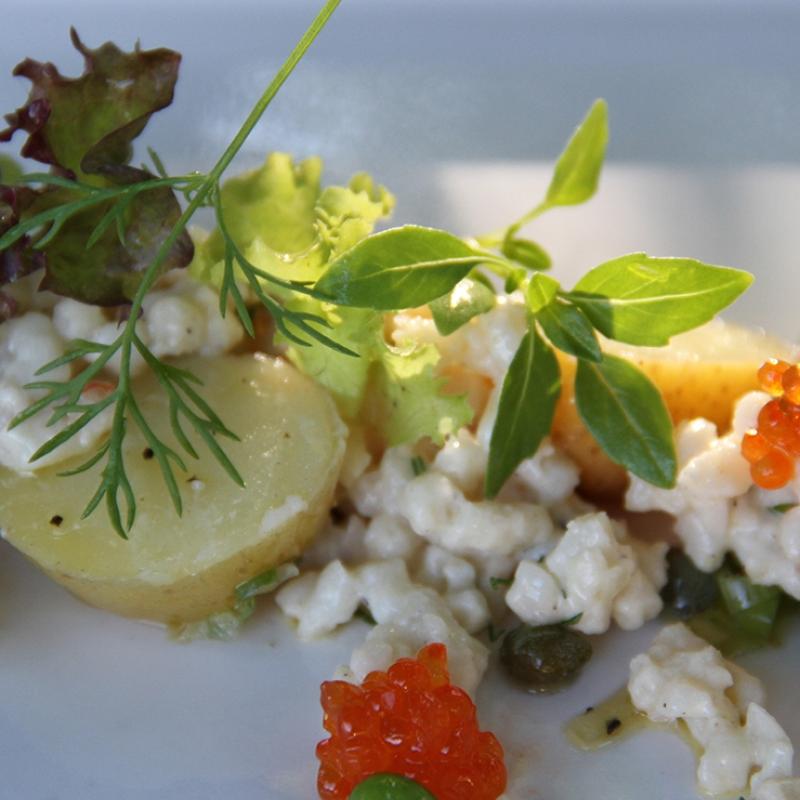 This recipe for pike pearls was inspired by a local fish product development day. The idea was to create an easy recipe to increase the use of pike both in domestic and professional kitchens. The dish was an immediate success, and it has had a place in the Tundra selection ever since. This dish works well as a small starter with Lappish almond potatoes, or as a pasta sauce. Pike pearls also add a nice touch to a cold potato salad with an oil-acid marinade or mayonnaise dressing.
