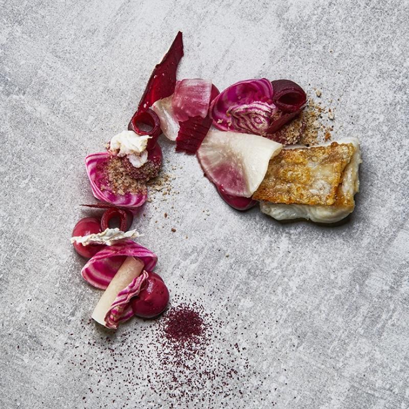 - Put all the beets on the plate, add some beet root cream and as well the dried beets. Finish with pistachio an the powder.