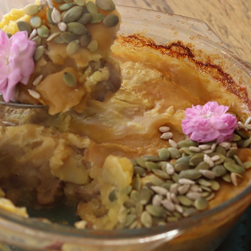 - Put the mash on top of this mixture. Then, add the cashew cream and place in the oven for 15 minutes (or until golden brown). Remove from the oven and decorate with seeds and flowers.