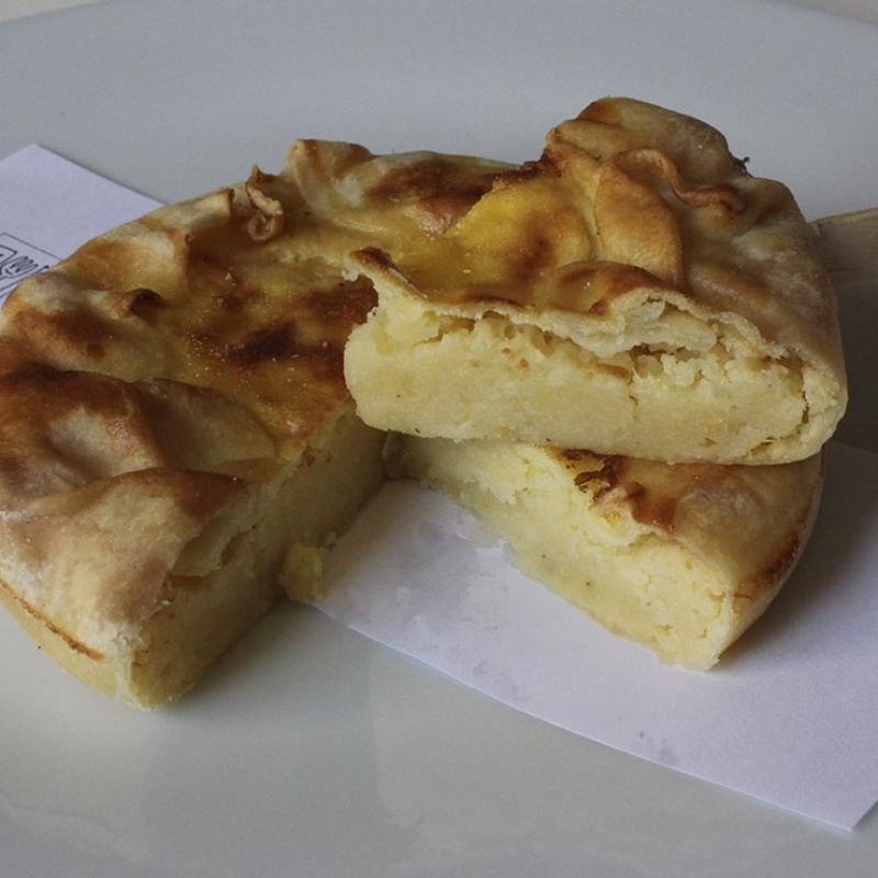 - Use the roller to stretch out the dough; line a low 28 cm mould; the dough should protrude by some 5 cm (minimum) on all sides. Put the potato, onion and cheese filling in the the mould; close the pie: fold the edges across the potatoes.