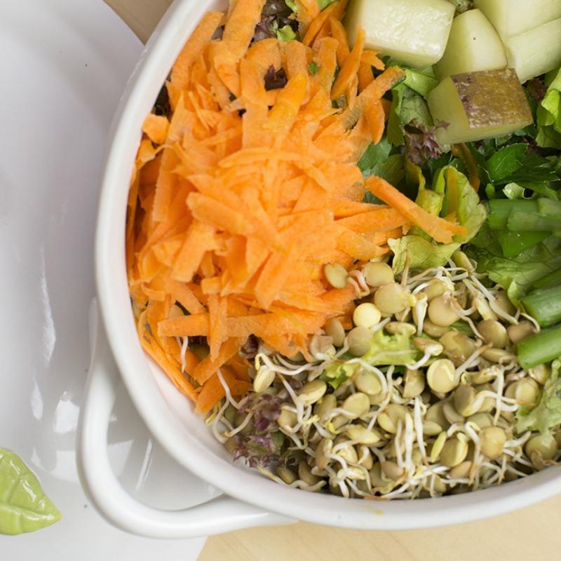 - Wash and dry the lettuce and herbs, mix and arrange in a bowl.