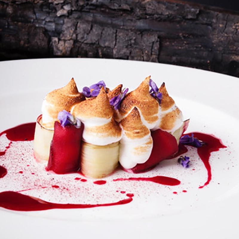 - Marinate the finely sliced beet root and rhubarb with their vinaigrettes. Form nice rolls from the vegetables.