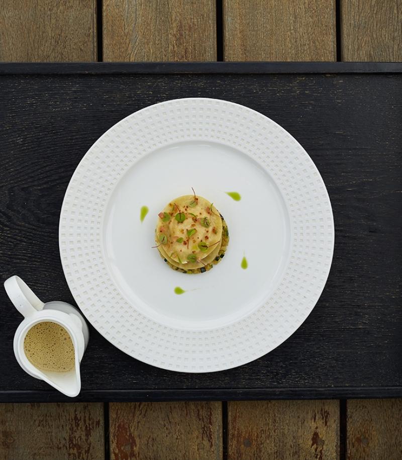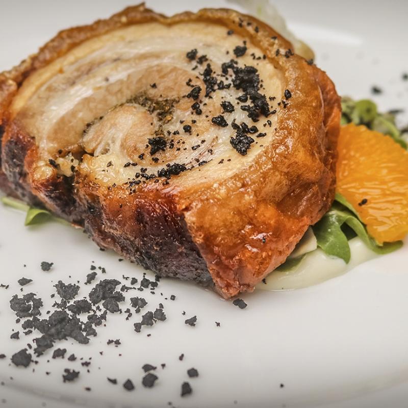 Roast pork belly, cream of cauliflower, Mediterranean salad (fennel, rocket, mandarin) and powdered olive