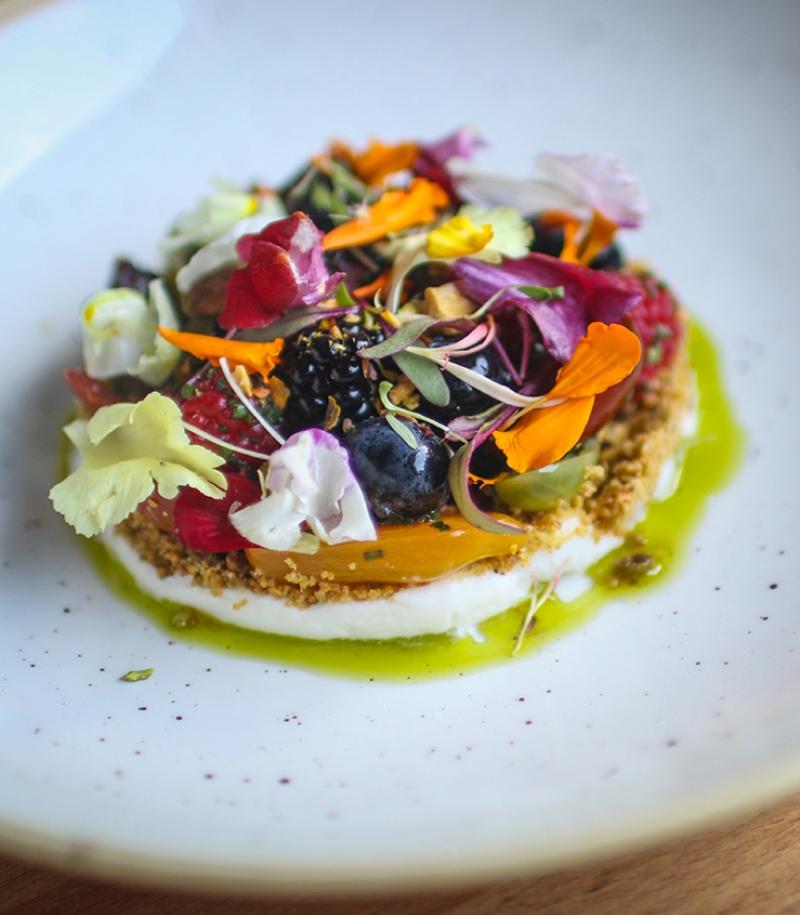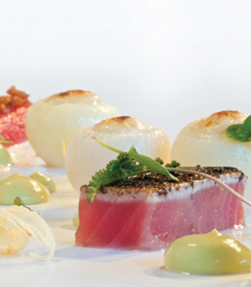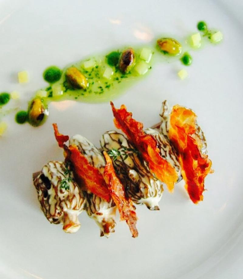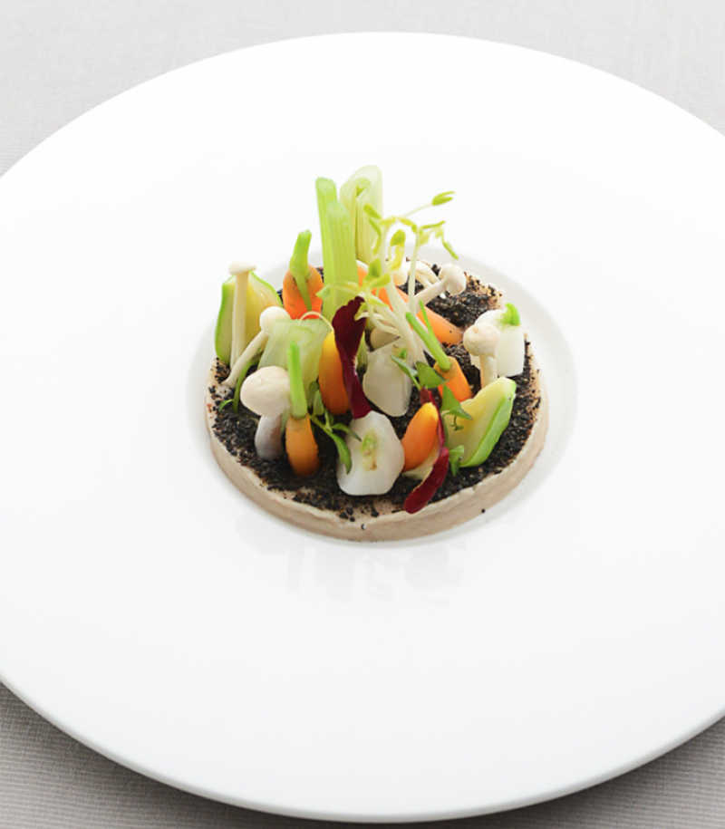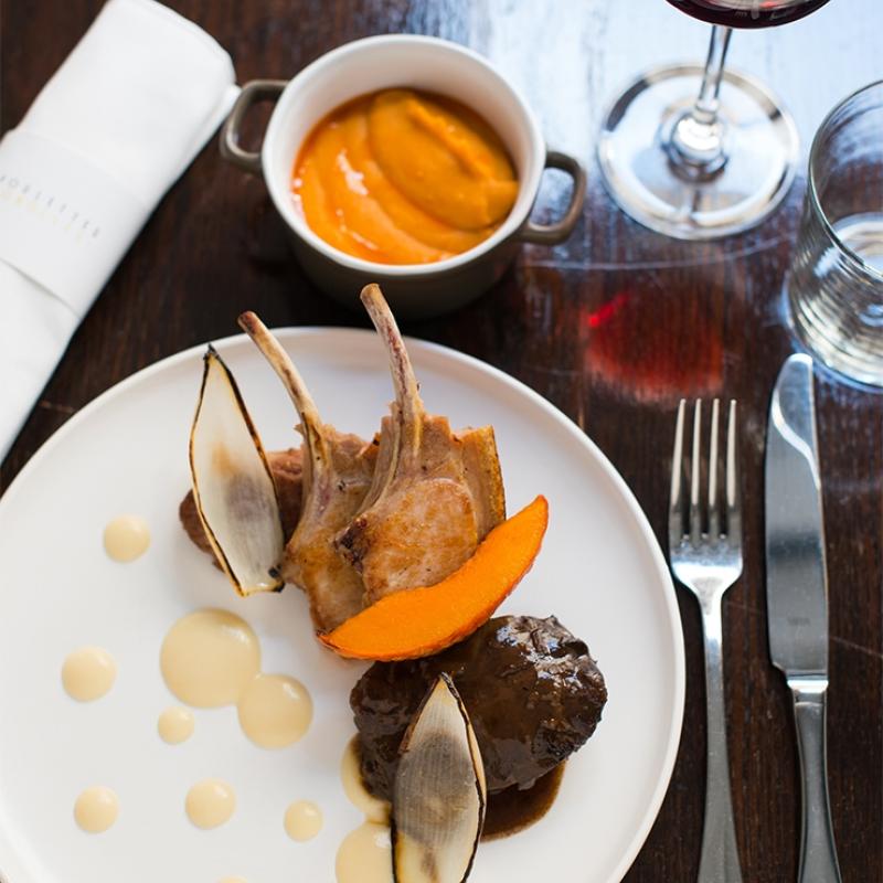 Position a braised cheek on the plate, add a rib and a piece of ham steak; use the stock as sauce.