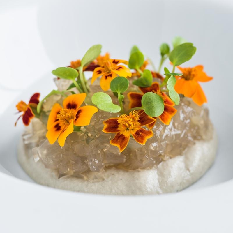 - Place a spoonful of roast potato jelly on top of the puree and garnish with marigold flowers and watercress.