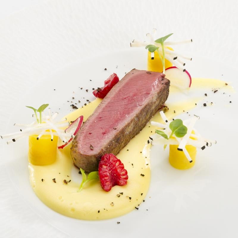 Roast venison with raspberry sauce, Tifda pepper, Agria mousseline and crisp radishes