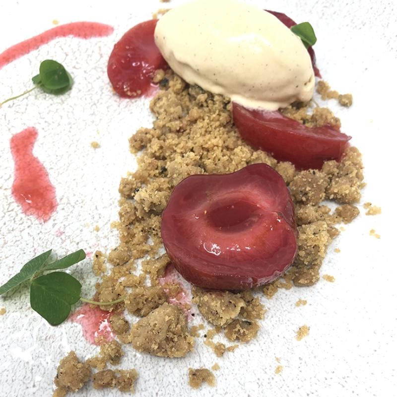 Heat sugar with a little water, once bubbling add in plums and stir. Cook for 5 minutes or until just tender. Set aside to cool.