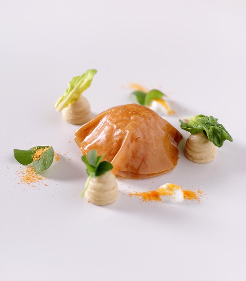 Remove heart and kidneys of the hare en make farce a of the dots, heart and kidneys. Remove the tenderloins from the saddle of hare. Roner the saddle of hare 18 minutes on 64 degrees. Make a roller of the tenderloins (diameter 3cm). Remove the saddle of hare from the carcass and role the saddle of haze in with smoke-dried pork.