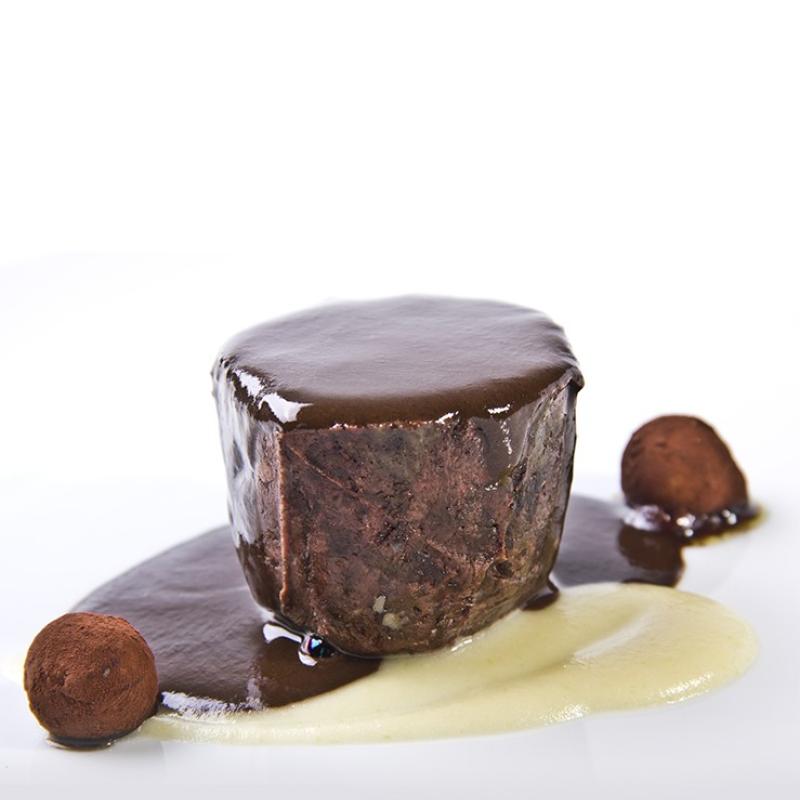 Gently heat some of the hare and add sauce. Accompany with duck liver truffles.