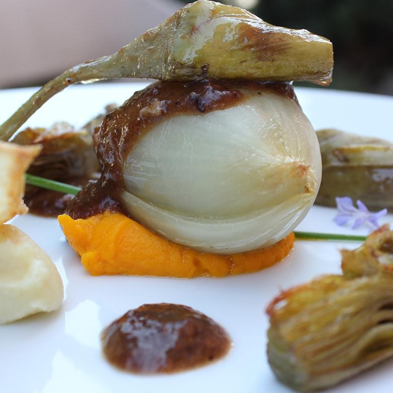 Salted onion stuffed with braised oxtail in gutturino wine with carrot puree and artichoke