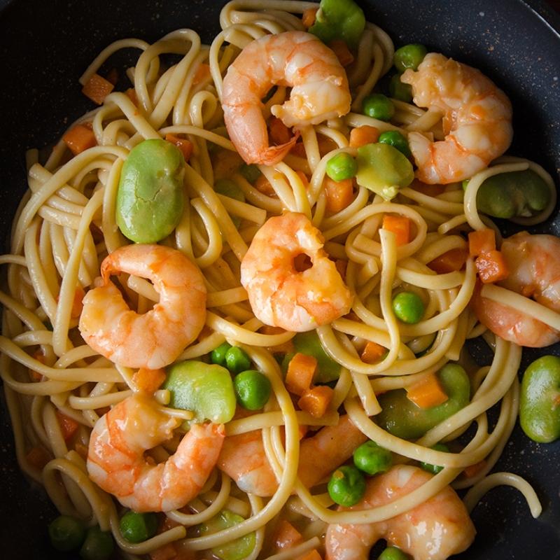 - Mix the pasta with the prawns, sauce and beans. Serve.