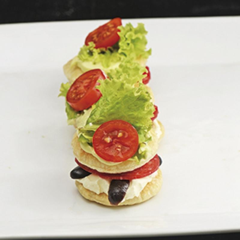 - Place a little of the cheese mixture on half of the little tapas; spread pieces of olive on the cheese and thin slices of dry salami; place another tapa on top.