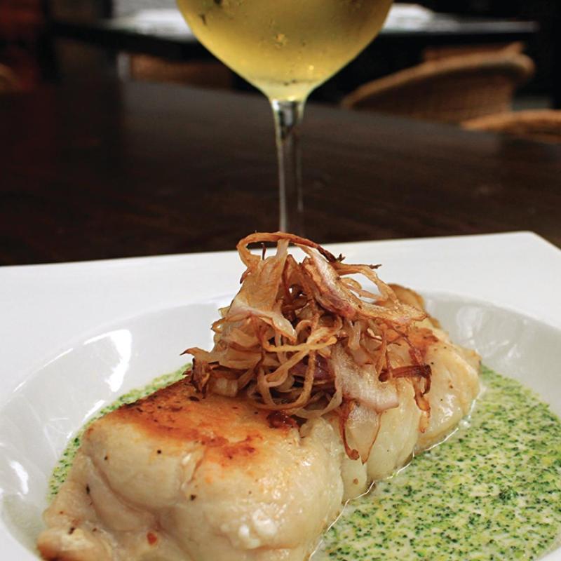 For the assembly: Place the cream of broccoli onto the plate, then the sea bass and, finally, the fried purple onion on top.
