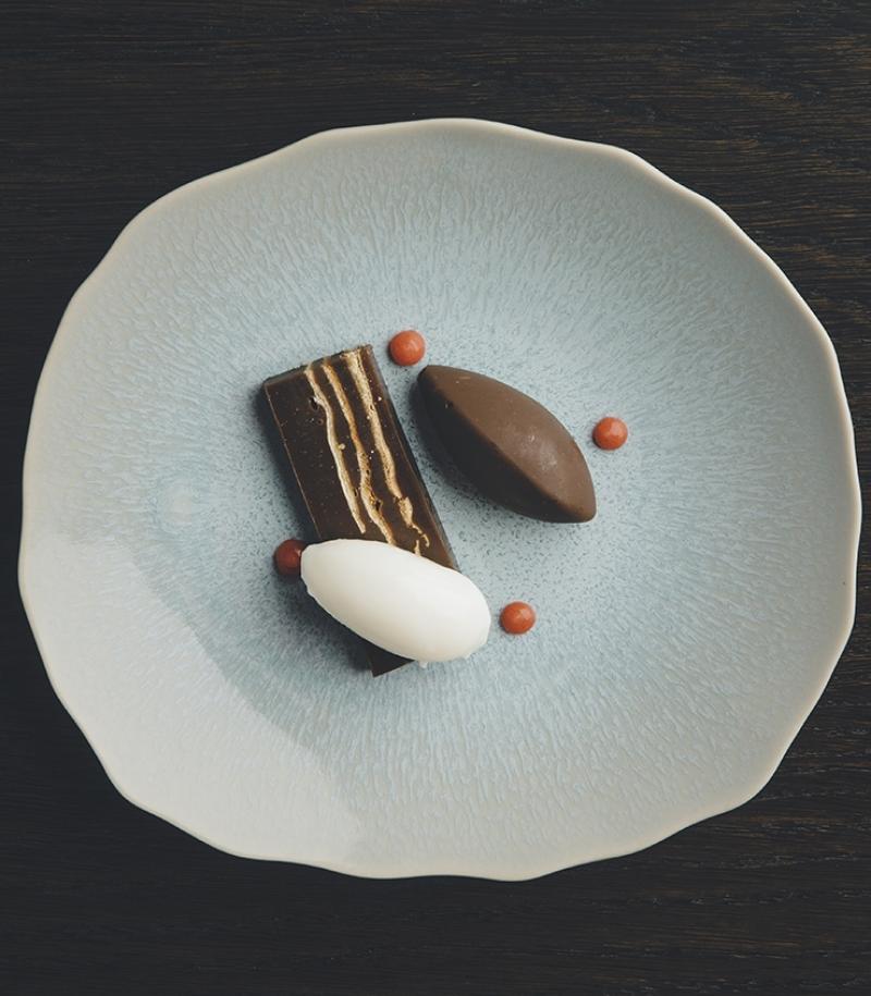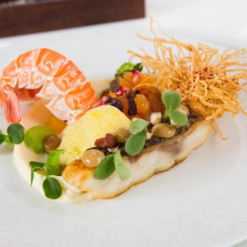 Mark the bass by making short parallel cuts in the skin. Then, fry in olive oil until crunchy; set aside; keep hot. Prepare the celery purée on the plate. Place the bass and prawns on the plate and drizzle a few drops of oil on them. Decorate with the celery, pomegranate seeds, orange and hazelnuts. Add the calamansi jelly, coffee mayonnaise and coffee jelly using a piping bag. Carefully place the scallop, prawn shell and mandarin foam on the plate. Rectify with sea salt and top off with green shoots.