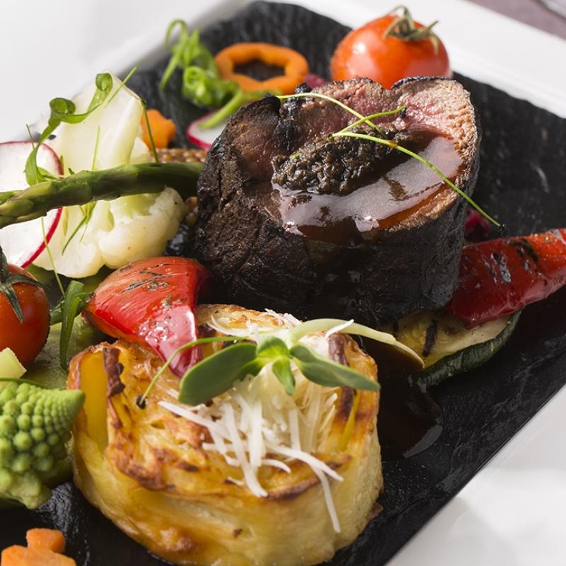 Slow cooked venison fillet with blackcurrant sauce and potato gratin