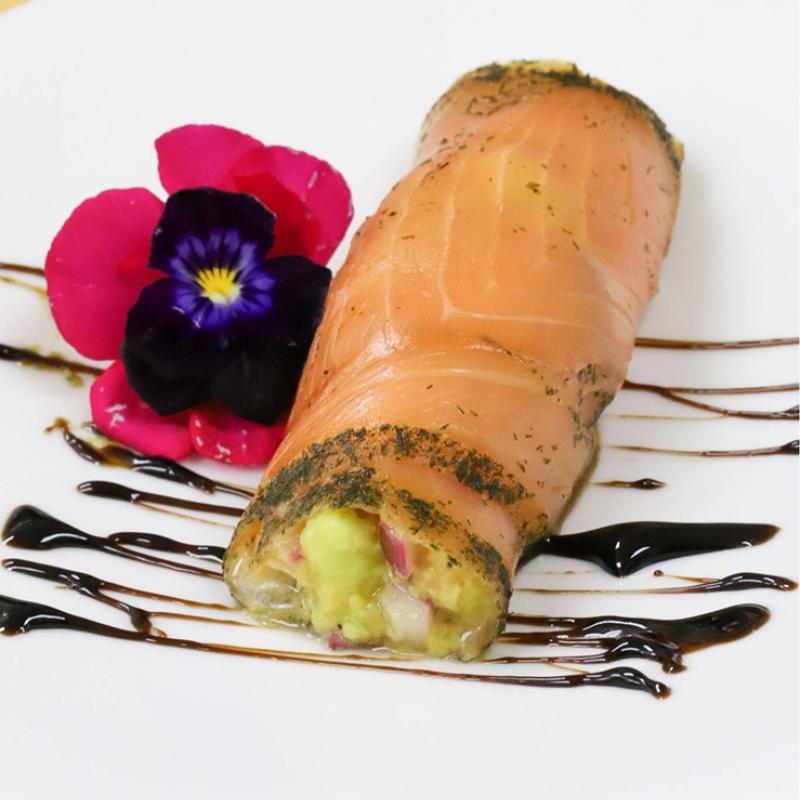 Pour some balsamic reduction onto either a medium or large plate, creating an irregular thread-like pattern; on top, place the salmon roll and decorate with finely chopped parsley and/or edible flowers.