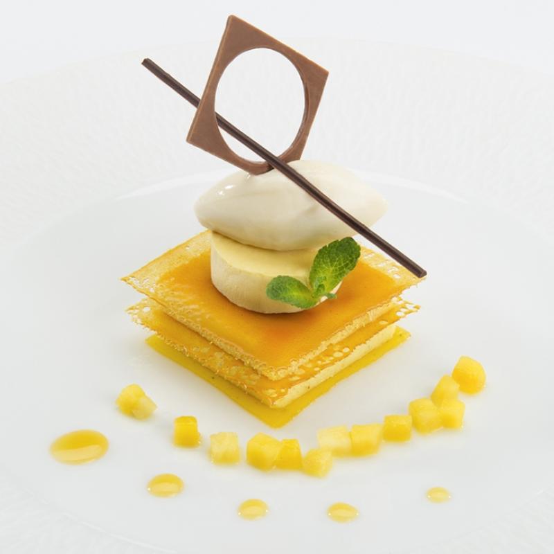 - Add a little brunoise-cut fresh mango and pineapple and passion fruit coulis. Decorate with gold leaf, fresh mint leaves and lemon grass shoots.