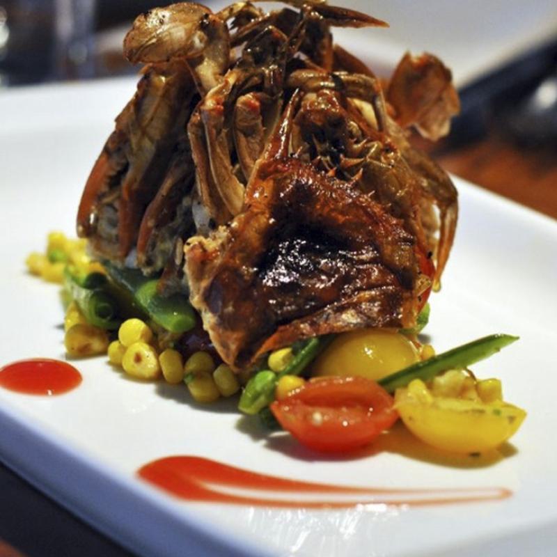 Dish: Sautee crabs till crispy. Finish with butter. Plate the succotash on the bottom of the plate. Cut the crabs in half and place them upwards over the succotash. Dot the plate with the gelee and serve.