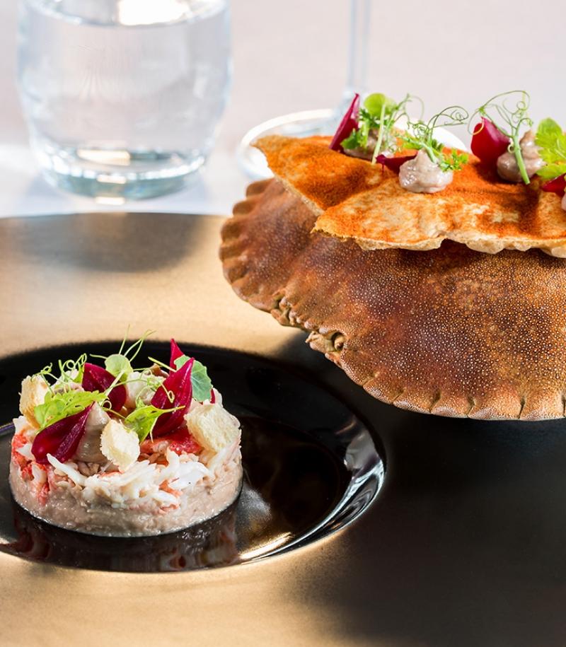 - Deglaze with white wine add crab, herbs and cooked pasta.