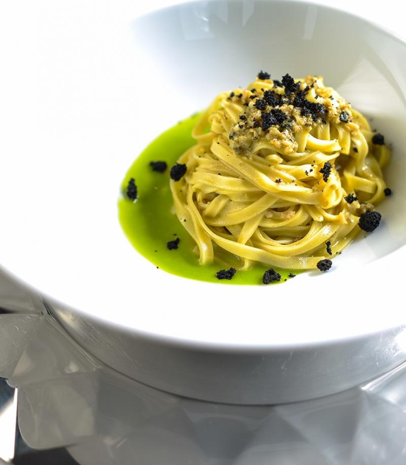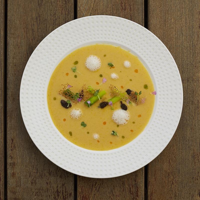 Squash and Tonka bean soup (cold) Seasonal wild mushrooms Coconut foam and bread tuiles with turmeric