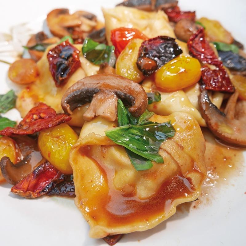 - Cook the tortelli in abundant boiling salted water. Once they float, cook for a further 1-2 minutes. Meanwhile, put oil into a pan on a high heat and quickly sauté the sliced mushrooms with the tomatoes and chopped, drained dried tomatoes. Add in the diced garlic and basil; remove the pasta. Drain the pasta and then sauté it for 1 minute in the pan. Serve hot with a few basil leaves on top.
