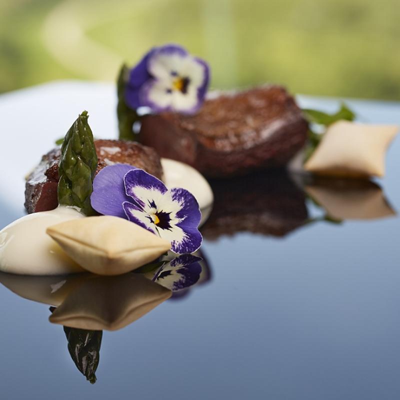 Garnish: 3 x asparagus, edible flower, oxalis, cracker 3x