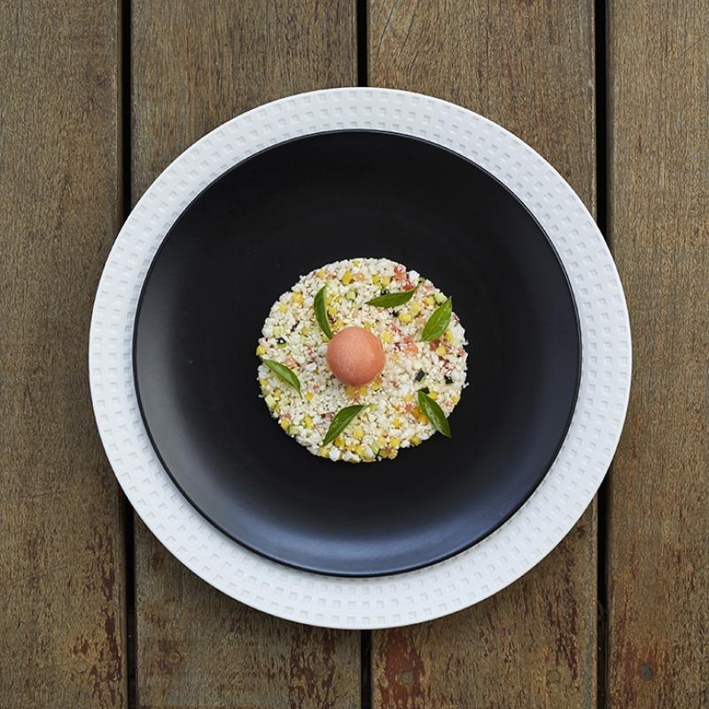 Tabbouleh with cauliflower, green mango, citrus caviare and Huahine melon sorbet