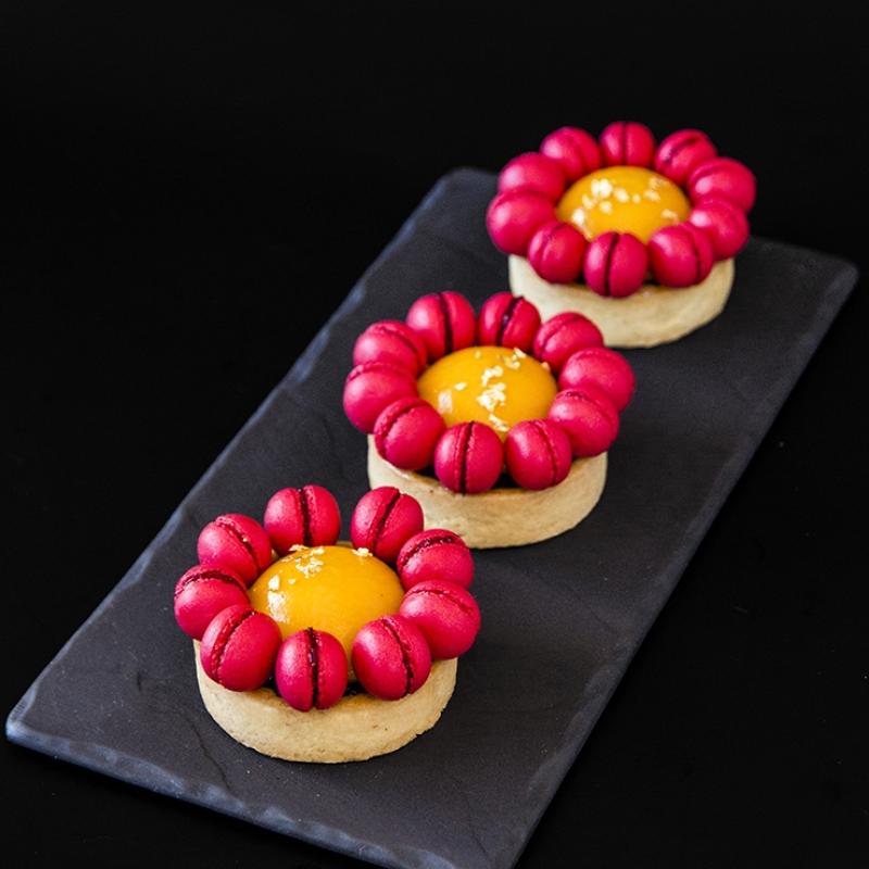 Pate sucree; Vanilla pastry cream; Raspberry cremeux; Mango cremeux; Macarons.