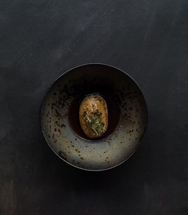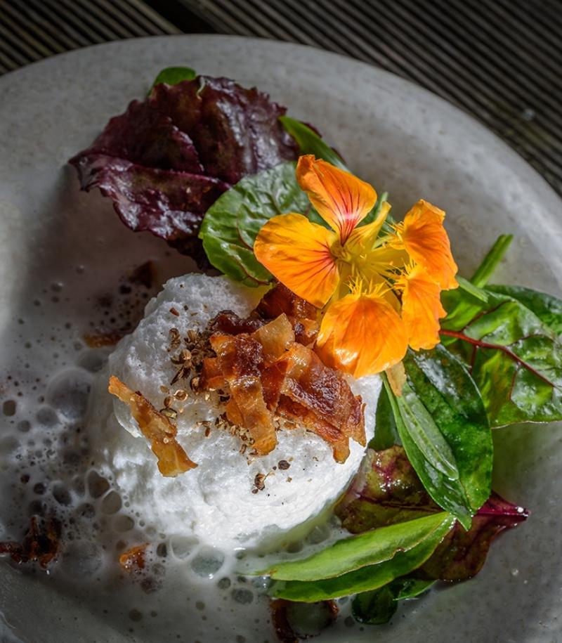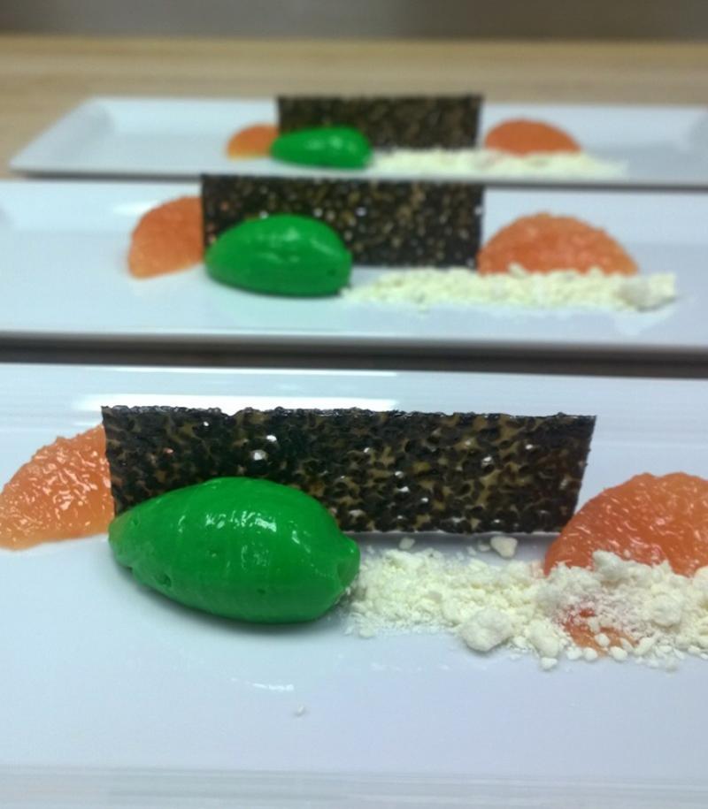 Cut the leek and the tender garlic in brunoise and poach it with a knob of butter without browning, then add the peas, reserve some fresh peas for the plating and cover with the vegetable stock until tender, blend and emulsify with a trickle of extra virgin olive oil and season with salt and pepper, set aside.