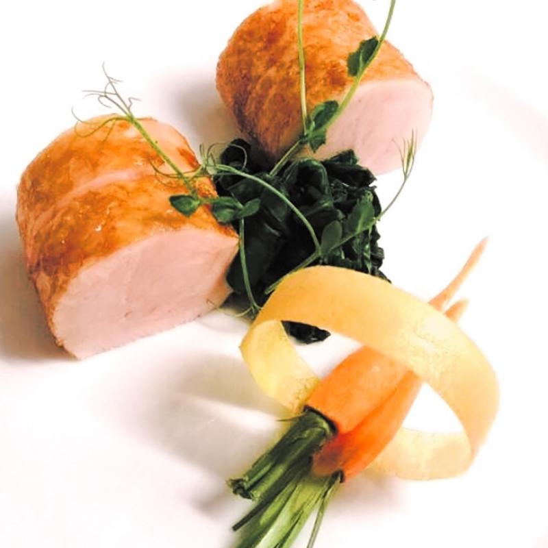Smoke the turkey meat, season and cook it in sous vide for 3 hours at 600C