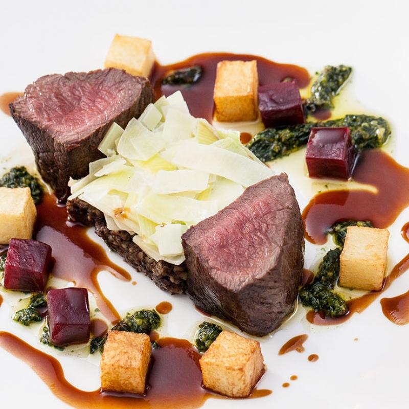 Venison, its own haggis, chanterelles, leeks, beetroot, basil pesto, truffled jus