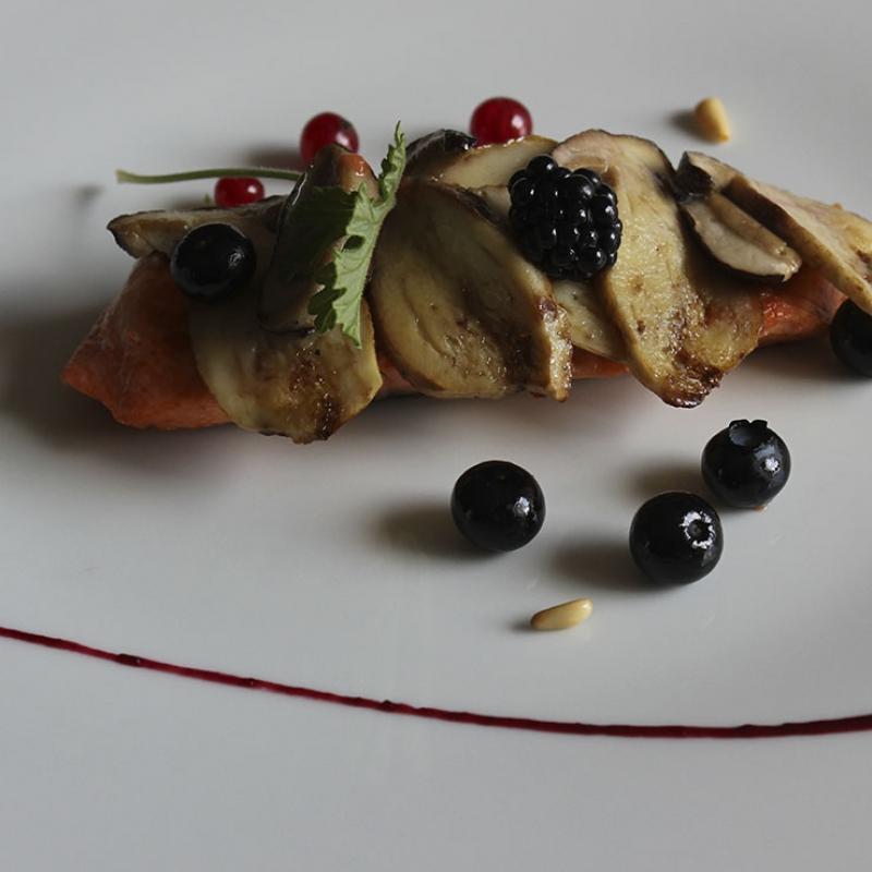 - Serve the trout fillets with the porcini, wild berries, endive salad and raspberry sauce.