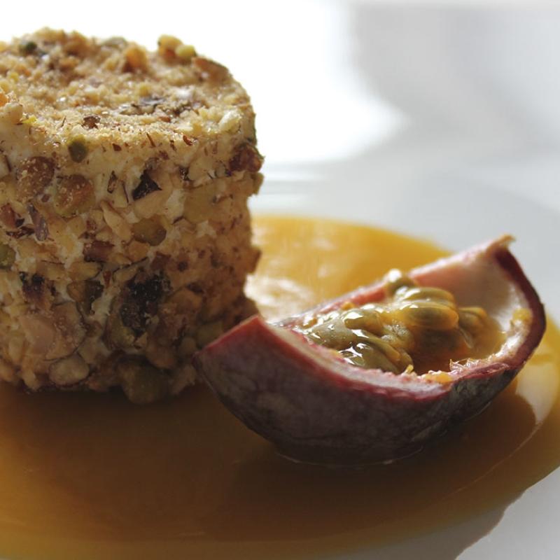 White Chocolate Mousse With A Nutty Crust & Passion Fruit Sauce
