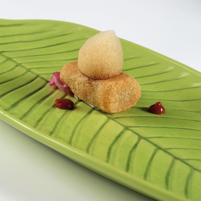 Make a pinned croquette with the yucca dough. Make a hole and fill with the sauté and cheese. Fry in very hot oil for a few minutes and finish off in the oven. Place the hot croquette on a small flat plate; add the foam on top. Decorate with flowers.