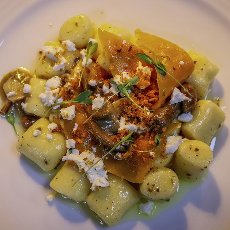 Yucca gnocchi fried in truffle butter, mixed mushrooms, squash and fresh goats cheese