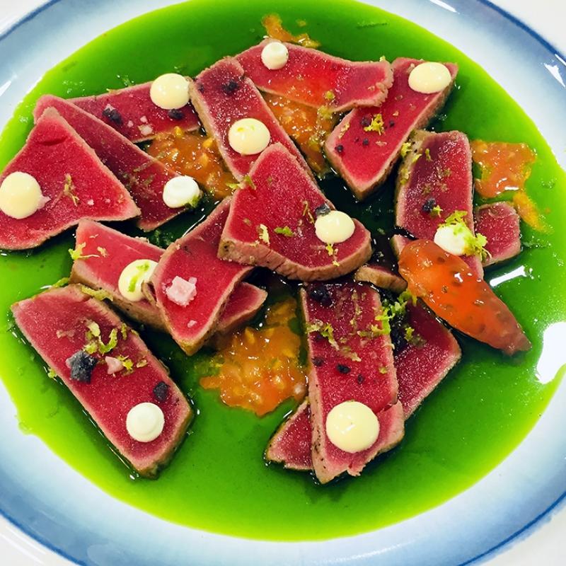 - Poner en el fondo del plato el aceite de albahaca. Encima de este, las laminas de atún caliente y gotas dispersas de la crema de queso.