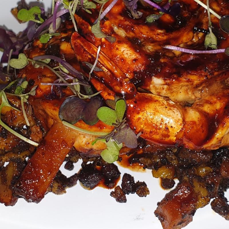 Brocheta de gambas en caña de azucar con glaseado de sirope de caña de azucar con ron y habanero,