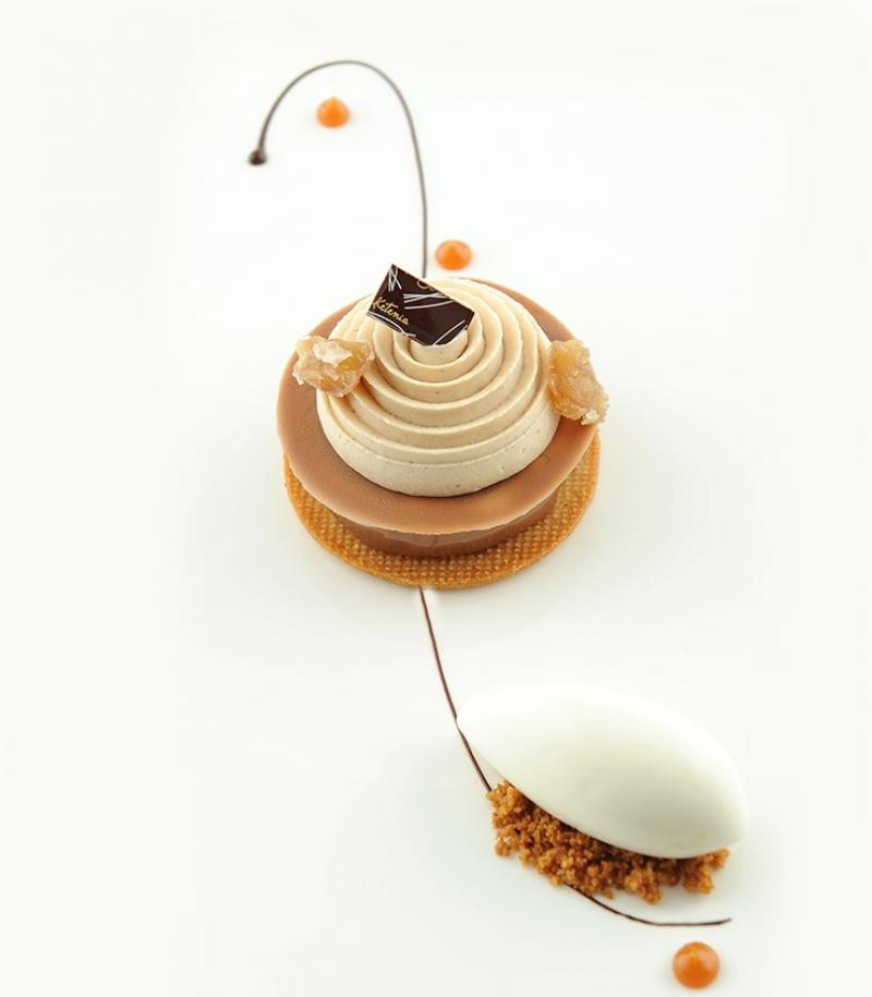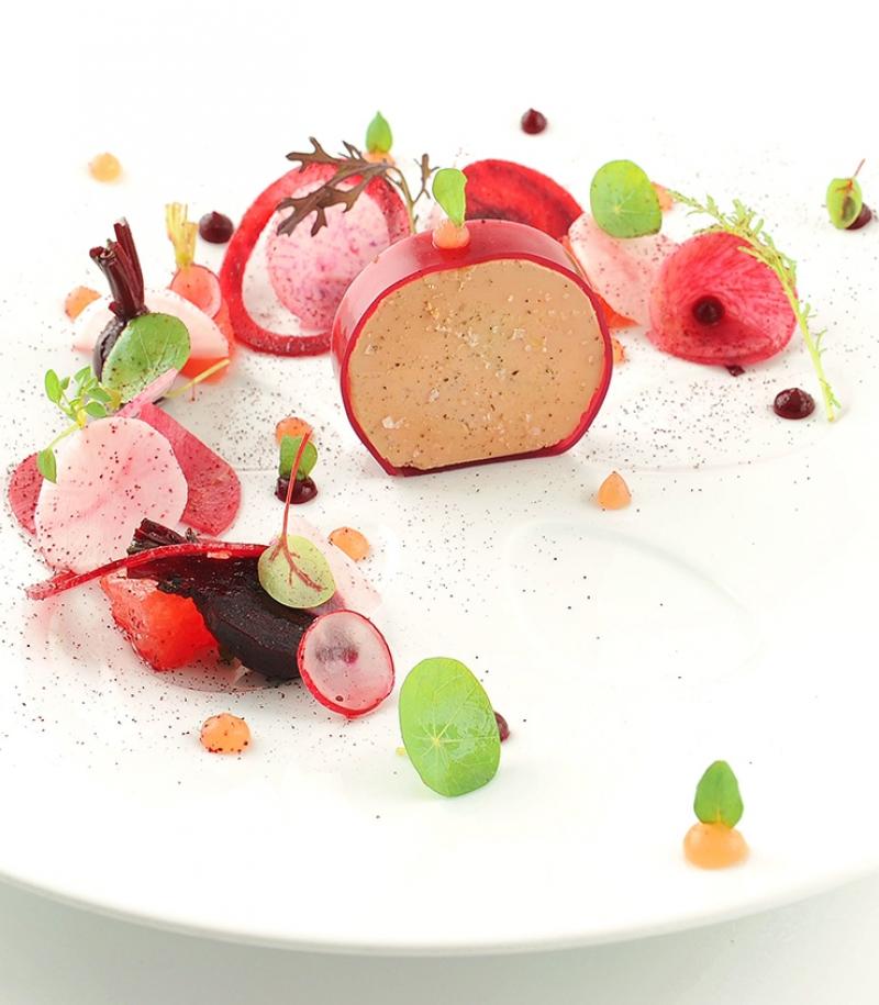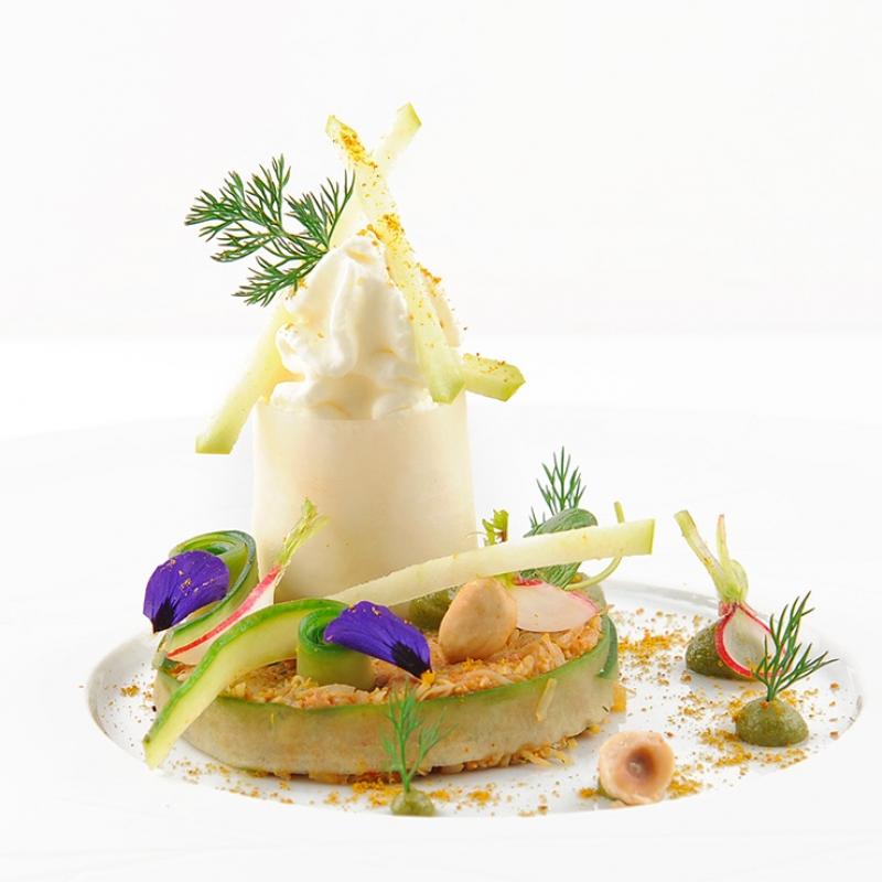 Buey de mar al curry, aguacate, rábano y manzana verde