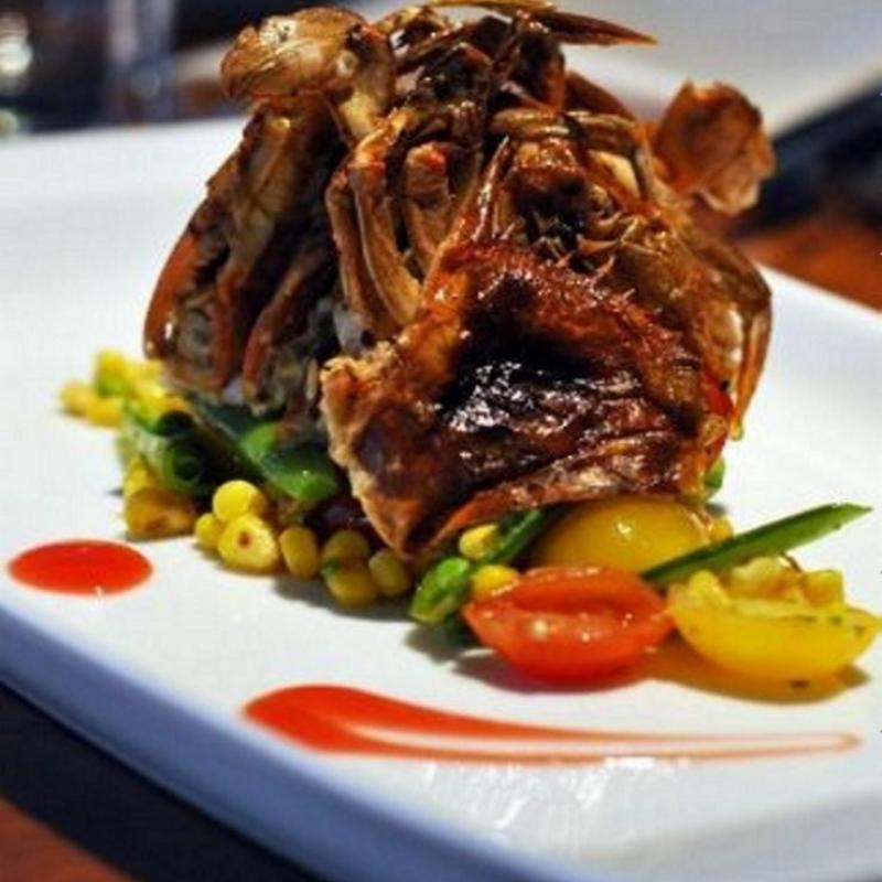 Saltear los cangrejos hasta que estén crujientes. Acabar con mantequilla. Emplatar en succotash en el fondo del plato. Cortar los cangrejos por la mitad y colocarlos hacia arribasobre el succotash. Salpicar el plato con la gelée y servir.