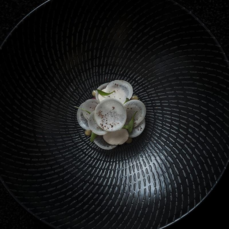 Aliñar con salsa de miso y colocarlas en el centro de un bol, cubrir con capas alternas de champiñones y nabos.