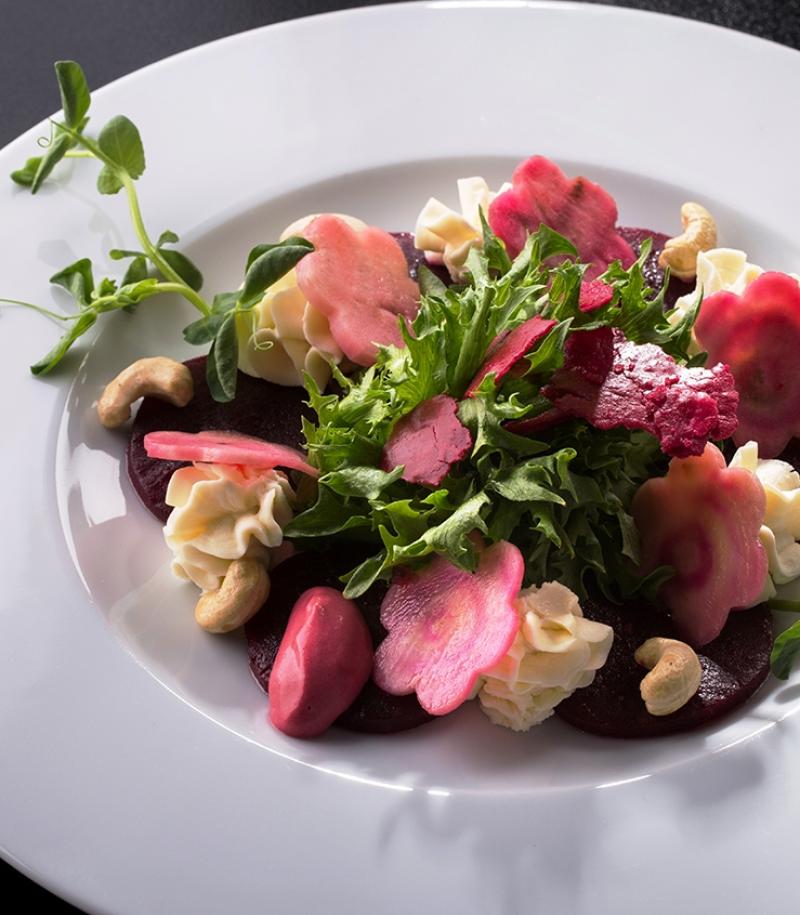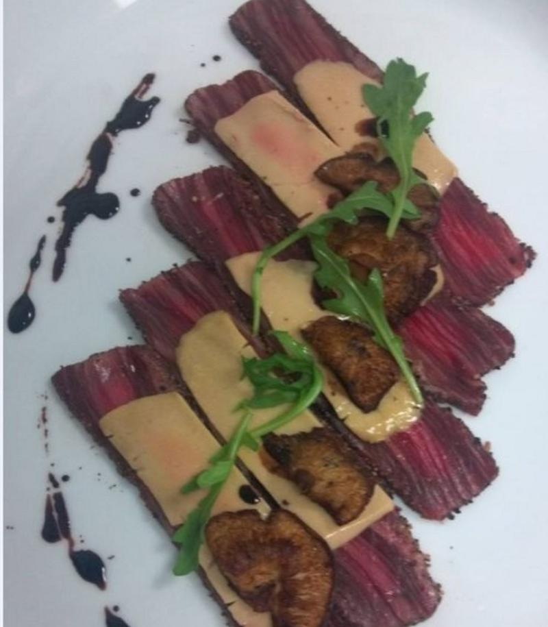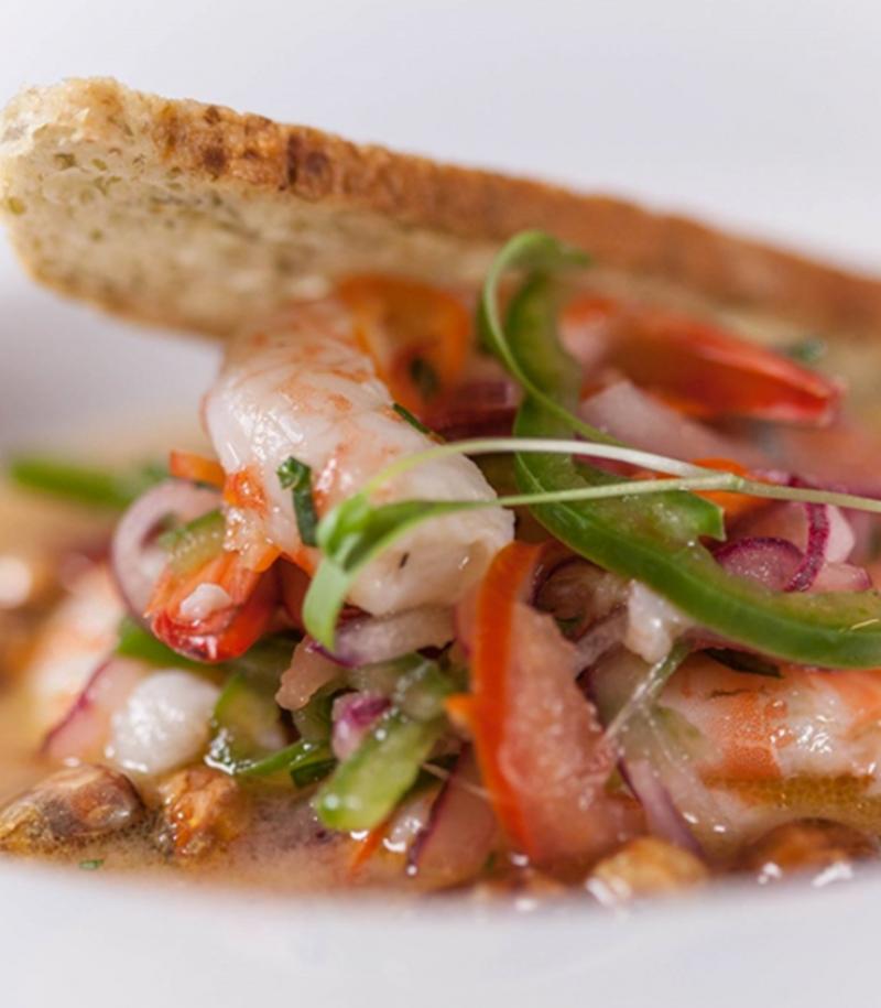 Corvina al ajillo, criollo arroz con coco y pure de guandu